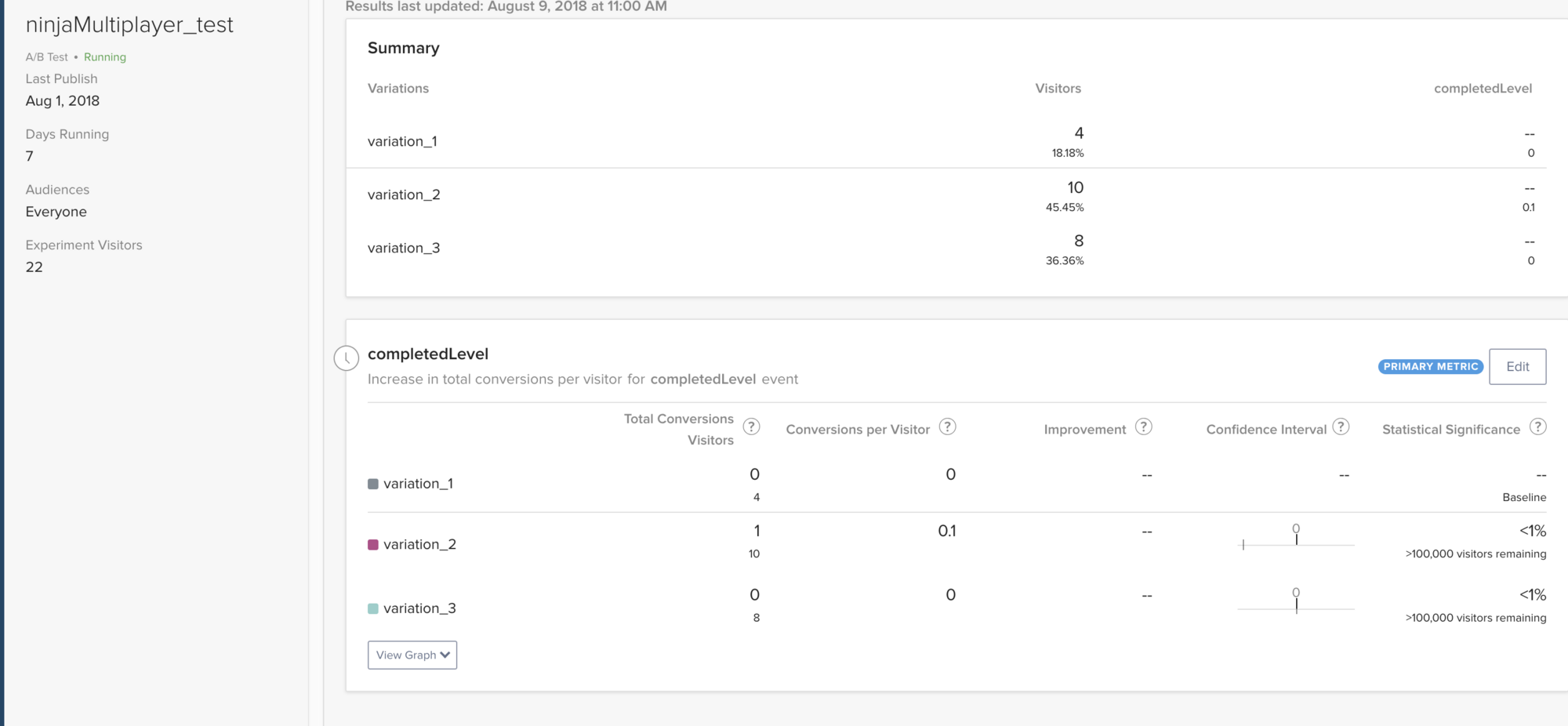 The goal of this experiment was to see which level in the multiplayer game provided the highest amount of engagement. Additionally, we wanted to test how easy each level was to complete by taking the percentage of people who actually went through the door to move on to the next stage. In order to measure this information, we need to setup three different variation variables in the Optimizely portal, and an additional completedLevel metric which tracks when the player enters the door and changes scenes.