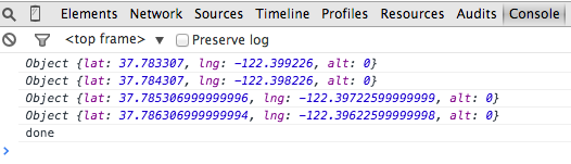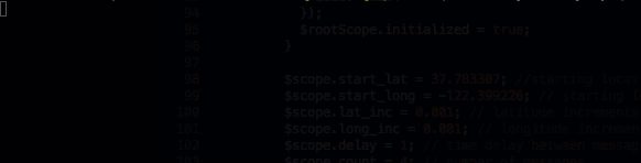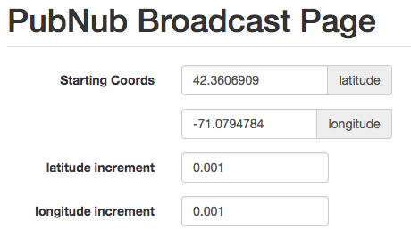 Now that you’ve sent a message through PubNub’s real-time service you’re ready to send some coordinates. In this app there are variables that control the starting location, the increment added to latitude and longitude, the delay between messages, and the number of messages. The user can change the hard-coded values by using the form fields.