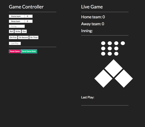 We can keep track of the game data in $scope.state and $scope.count. The counts will increment as the buttons for the balls, strikes, and outs are clicked. The value for the bases will either be zero or one, depending on if that particular base is occupied.