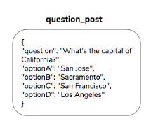 Here, we will use PubNub's Publish/Subscribe Model to have the admin publish the question to all of our game's players. The channel question_post will hold messages with the question's title and its answer options, encoded in JSON. The message structure for this channel is shown in the example below. We must use the same keys when publishing a message to the channel.