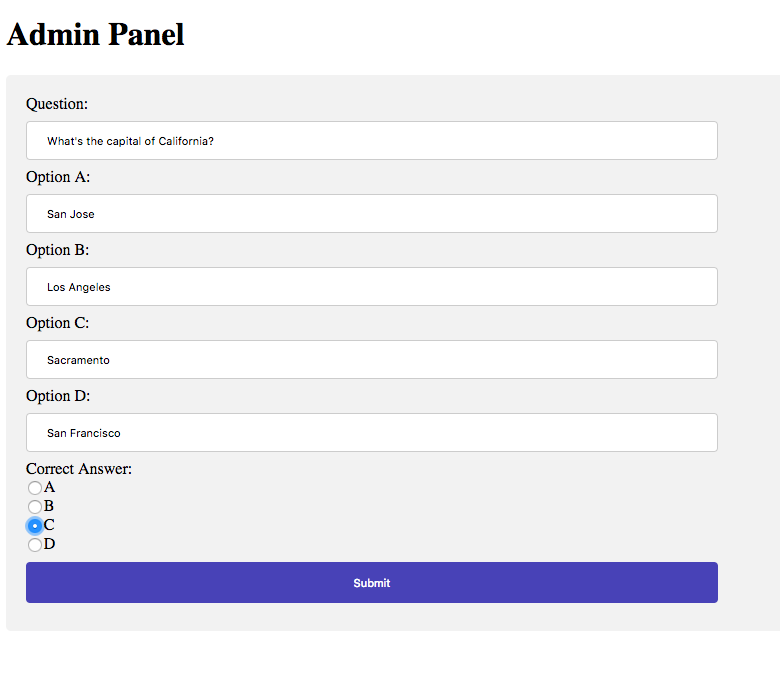 The Admin App will have a basic layout with 5 text fields: Question, Option A, Option B, Option C, and Option D. It will then have radio buttons to allow the admin to select which option is the correct answer. Finally, there will be a submit button. This simple layout can be created with the following code in index.html.