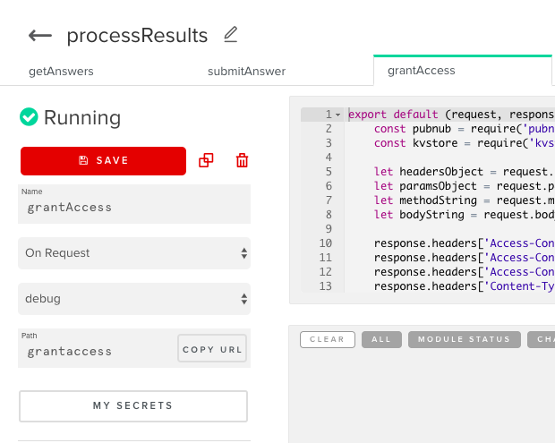 In order to set up PubNub in our app, we will head over to the PubNub Dashboard, to create a new project called HQDemo. In this new project, we will navigate to the sidebar and click on Key Info. For our Key Set, we will enable Presence, Functions, and Access Manager. Then click on functions, in our sidebar. Here, we will create a module called processResults and within the module create 3 functions: getAnswers, submitAnswer, and grantAccess.