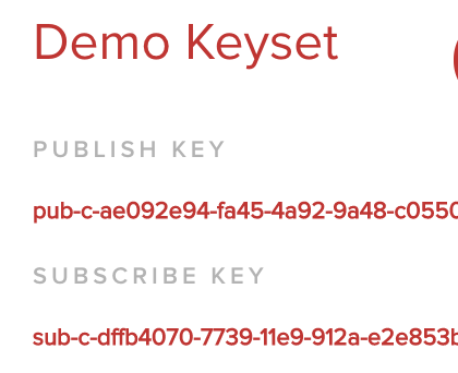 Once you are signed up, get the subscribe and publish keys. Click the project created for you (probably called “Demo Project”) and then click the keyset (probably called “Demo Keyset”). Then you can copy the Publish and Subscribe keys.
