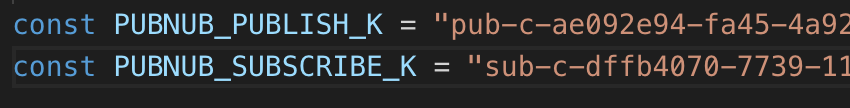 The PUBNUB_SUBSCRIBE_K and PUBNUB_PUBLISH_K should be the same variable names as those we filled in at the “Signing up for PubNub and setting keys” step above.