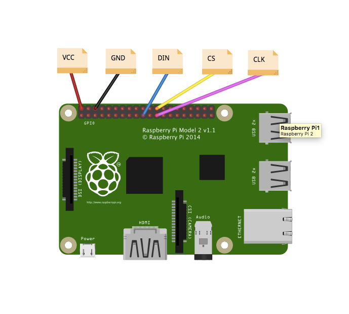 To connect the matrix to your Raspberry Pi, you can just directly plug each of the pins on the matrix into the pins on the Pi using five female/female wires. Or, if you want, you can use 10 male/female wires and a breadboard. Like you can see in the diagram below, VCC should go to 5V, GND to Ground, DIN to GPIO 10 (MOSI), CS to GPIO 8 (SPI CS0), and CLK to GPIO 11 (SPI CLK).