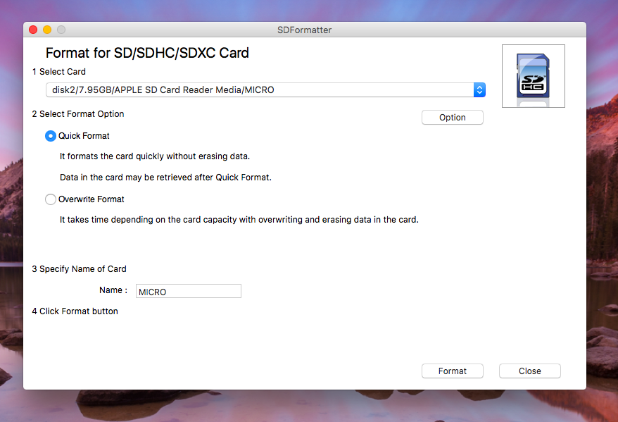 The first step to using your Raspberry Pi is making sure that you have an operating system (OS) to work with. If you bought your Pi as part of a kit, your micro-SD card might already have this installed, so double check whether it’s blank before continuing. If you don’t have anything installed, there are a couple steps you need to complete. First, format your micro-SD card by installing SD Formatter 4.0 on your computer and plugging in your card with an adapter. After opening up the software, select your card and click Format as shown below.