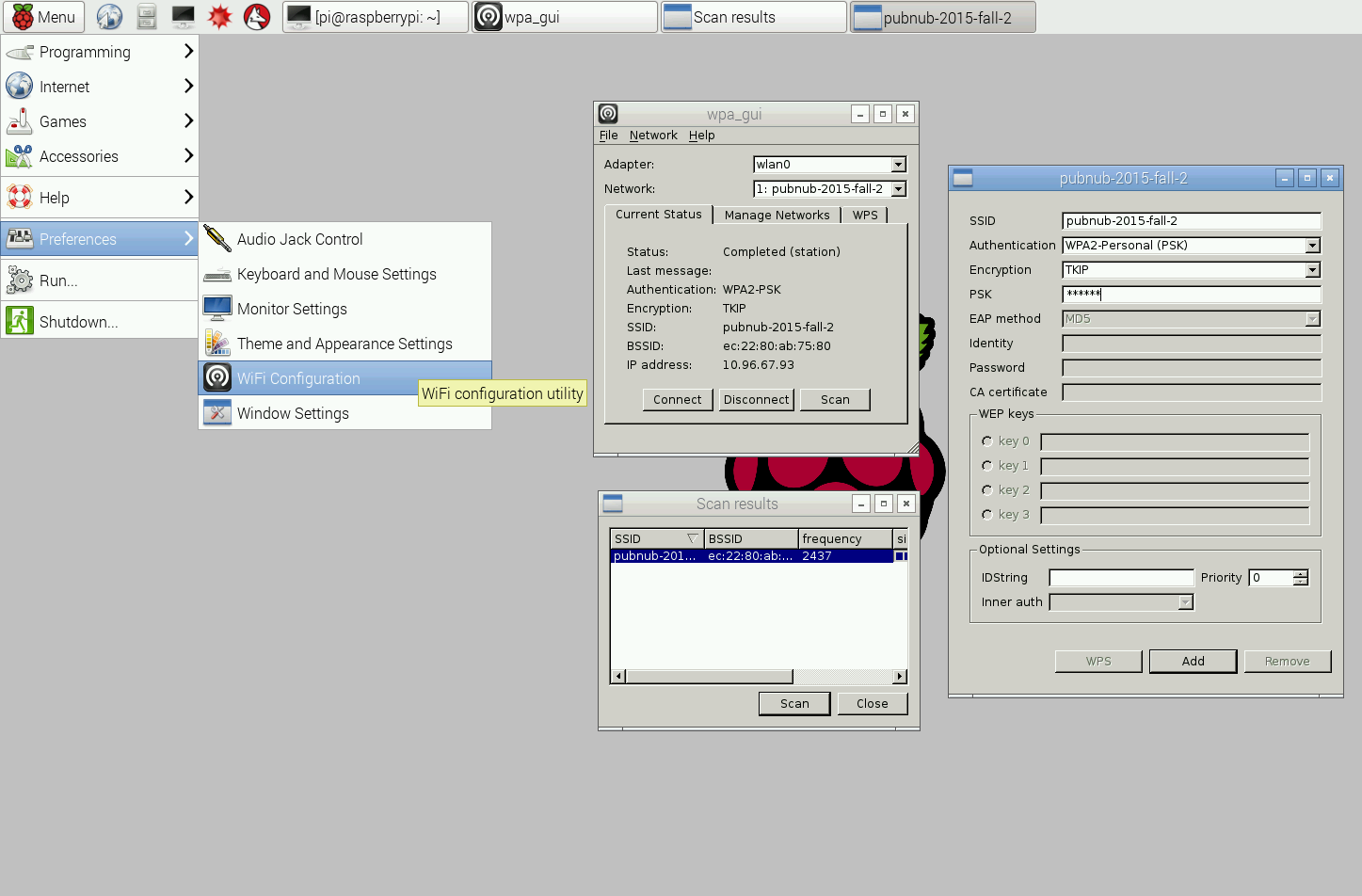 To connect your WiFi dongle to the internet, go to Menu > Preferences > WiFi Configuration. Press Scan to view available networks. Then, double click your network and enter the network password in the box labeled PSK. Click Add and you should connect to the network.
