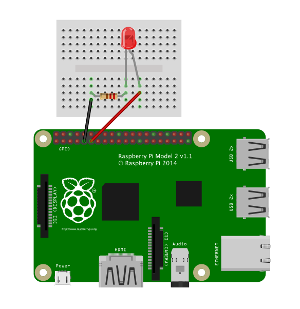 The LED circuit is really, really simple, as you can tell from the picture above. All you need is an LED, a 330Ω resistor, a breadboard, and two male/male wires to put it together. Wire a GPIO pin and a Ground pin on your Raspberry Pi to the breadboard. Then, connect one end of your resistor to the Ground wire, and the other to the short leg of the LED. The long leg of the LED connects to the GPIO wire, and you’re done!