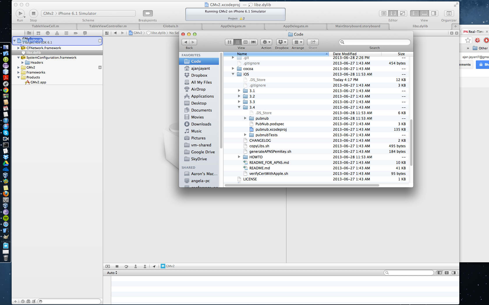 While the UI might draw a person to the app, the core of iOS Group Messenger involves sending messages and receiving them. That’s where the PubNub Data Stream Network comes in. PubNub provides an easy-to-use framework that allows users to send and receive messages seamlessly. All you need is a developer account and the PubNub libraries in order to send and receive messages on channels specified by the app itself. I simply dropped the folders in (shown below):