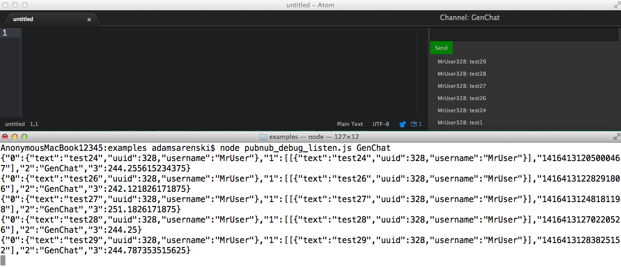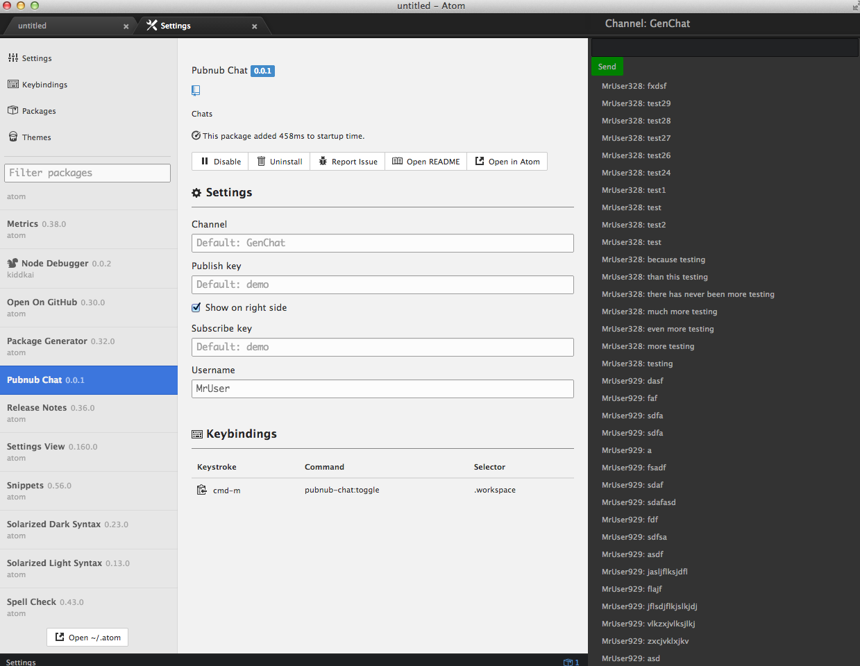 This inits PubNub and allows you to use the javascript methods written into the package. Note that it uses the keys, which were defined in the Atom preferences as ‘demo’. The PubNub methods can be seen under the initChannel function in pubnub-chat-view.coffee.