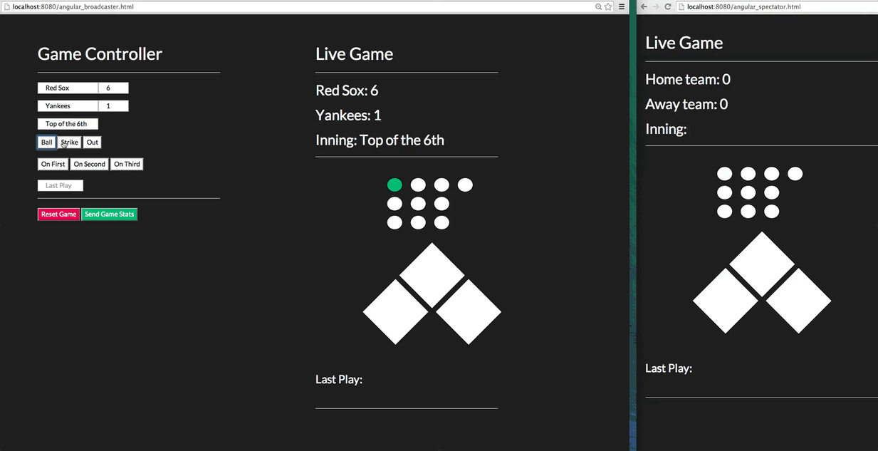 We have a live-working demo that you can play with here. Open up a single gamecast controller, then a couple of the end-user subscriber windows. Push updates and watch as they update in real time!