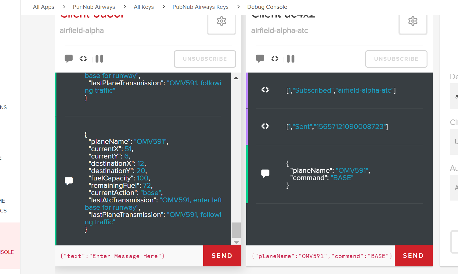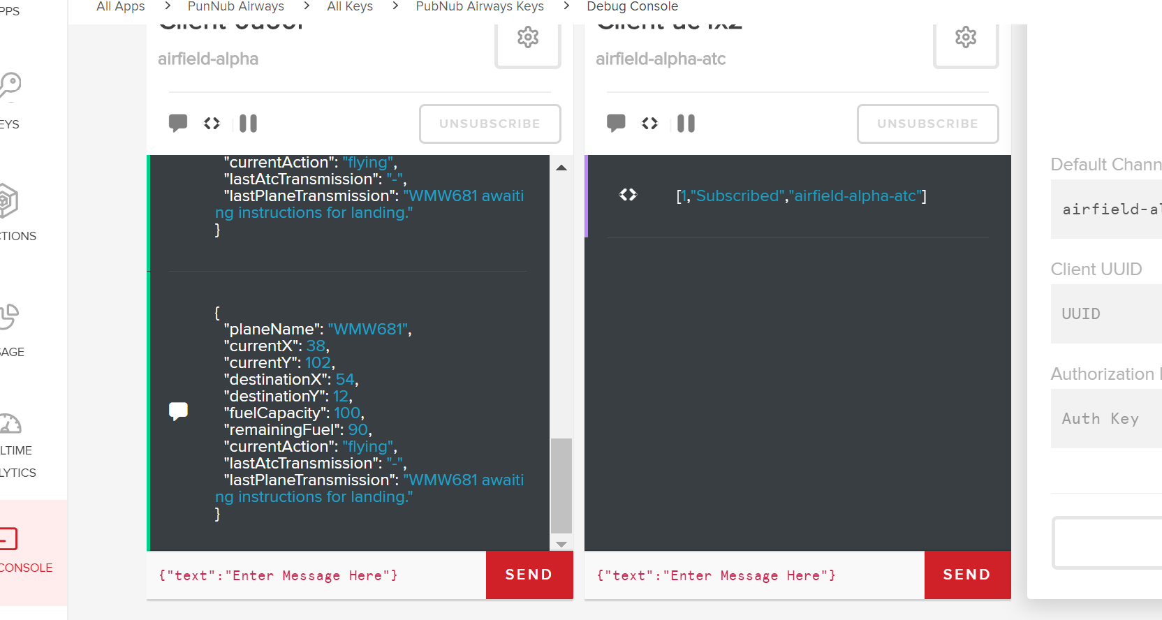 You will notice in the screenshot above that I have also added a client for the ATC_SUB_CHANNEL (again, as defined in broadcaster.js) which we can use to issue commands to the planes. This channel will eventually be replaced by buttons in our app, but for now, we can use the Debug Console to simulate this. As shown below, we can enter a JSON string such as: