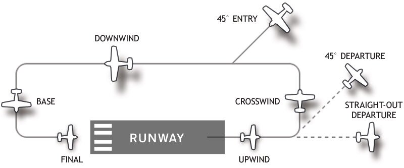The first file, airfield.js is our entry point into the application. It is responsible for initializing the other files and defines the positions of both the runway and flight pattern. We are basing our game on the ‘left-hand traffic’ flight pattern and will use the official naming terminology in the code. The names for the different parts of the flight pattern can be seen in the diagram below: