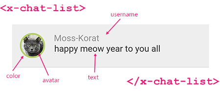 This custom element, <x-chat-list> takes attributes, avatar, color, username, and text.