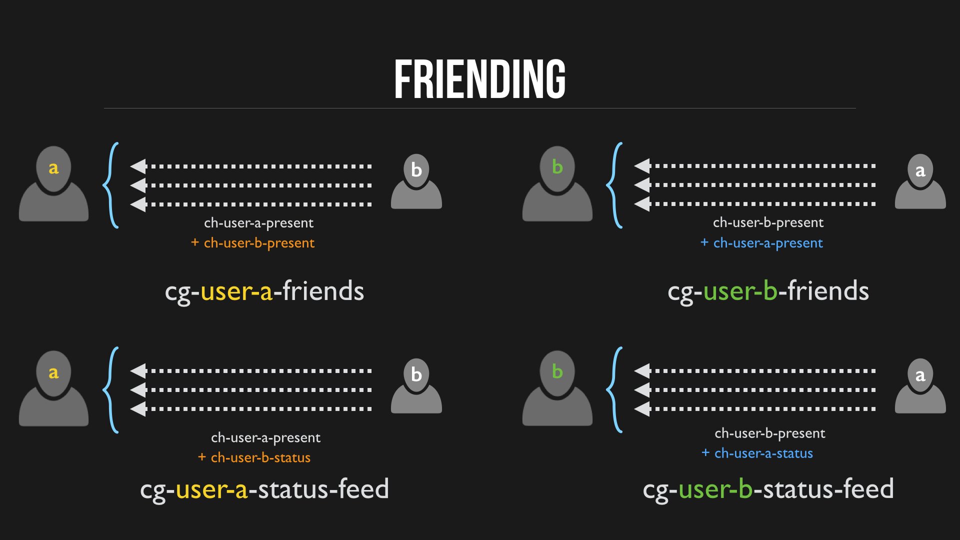 Expanding the Friend graph through friending is very straightforward: You are simply adding channels to channel groups! In the case of User A and User B becoming friends, you are adding the “present” channel to each users’ friends group, and adding the “status” channel to each users’ status-feed group.