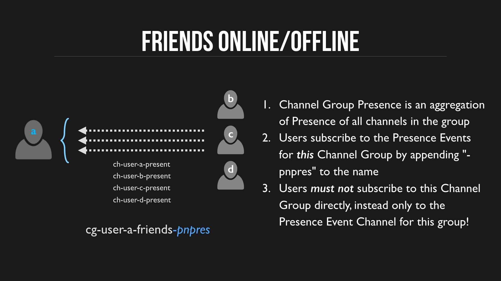 To see your friends online/offline status and be updated in real time, you subscribe to the friends channel group, but not directly, you subscribe to the Presence Event sister channel only, by appending “-pnpres” to the channel group name.