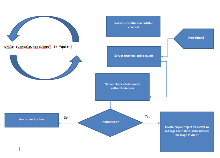 PubNub's C# game server is really just a command line application that loops and waits for a ‘quit’ command from the console. You might think that blocking code execution to wait for console input is a bad idea for a server, but since all of the PubNub callbacks are asynchronous, the system simply spawns a new thread to handle and respond to the request.