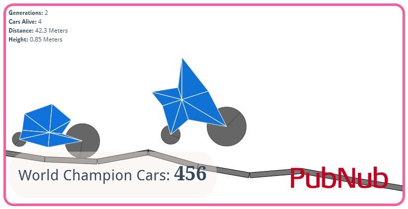 At PubNub, we love sharing our gaming high scores, from TrackPad Destroyer to Candy Box stats. So when our CTO, Stephen Blum, found Rafael Matsunaga’s Genetic Cars, a new competition began.