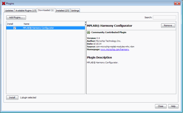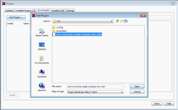 - Select the downloaded tab and click Add Plugins…, and then navigate to the MHC com-microchip-mplab-modules-mhc.nbm plug-in file, which is located in /utilities/mhc, and then click Open.