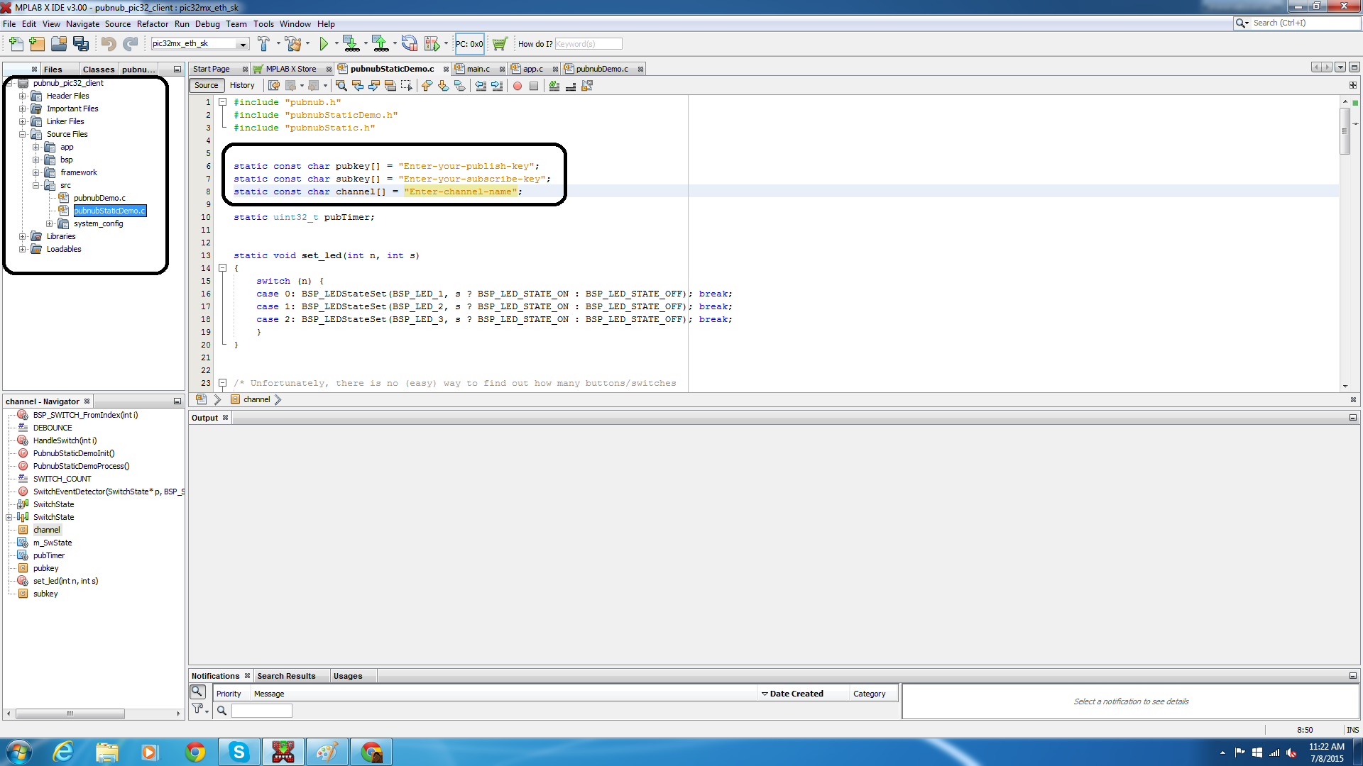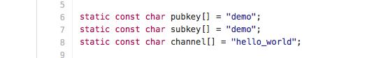 Note: You will find the channel and pub/sub keys in pubnubStaticDemo.c or pubnubDemo.c depending on whether you use the static or dynamic version.