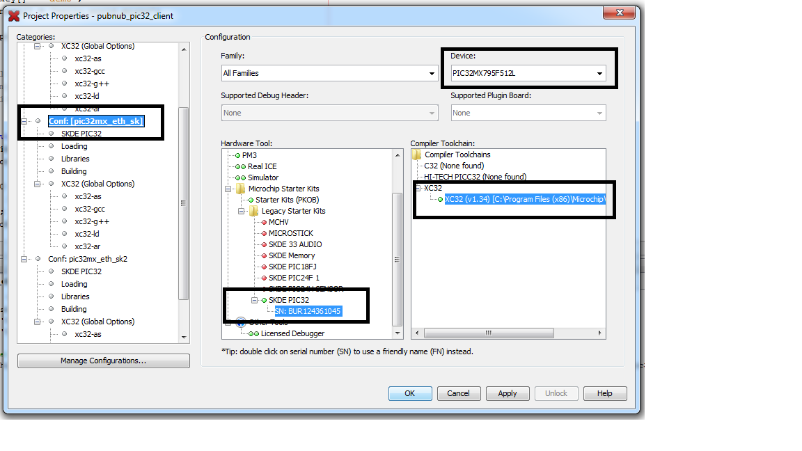 pubnub_pic32_client, choose properties. Make sure the options chosen are as shown in the image below. - In order to receive and send messages through the PubNub Data Stream Network, you'll need to set your publish/subscribe keys in the program.