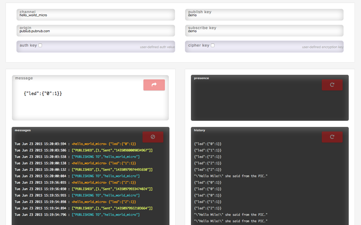- Running the PubNub client directly on the MPLAB IDE: