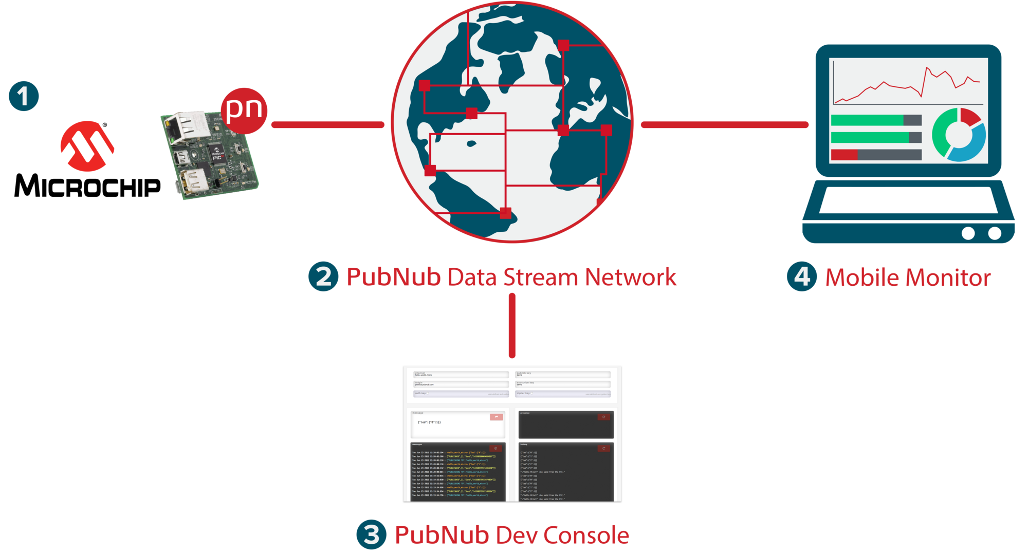 Microchip manufactures microcontroller, memory and analog semiconductors. They offer a line of powerful 32-bit microcontrollers (their PIC32 line), for embedded projects, and a number of software tools for easy development and deployment. PubNub on the other hand streams the between connected devices, from 1-to-1 (unicast), or 1-to-many (broadcast).