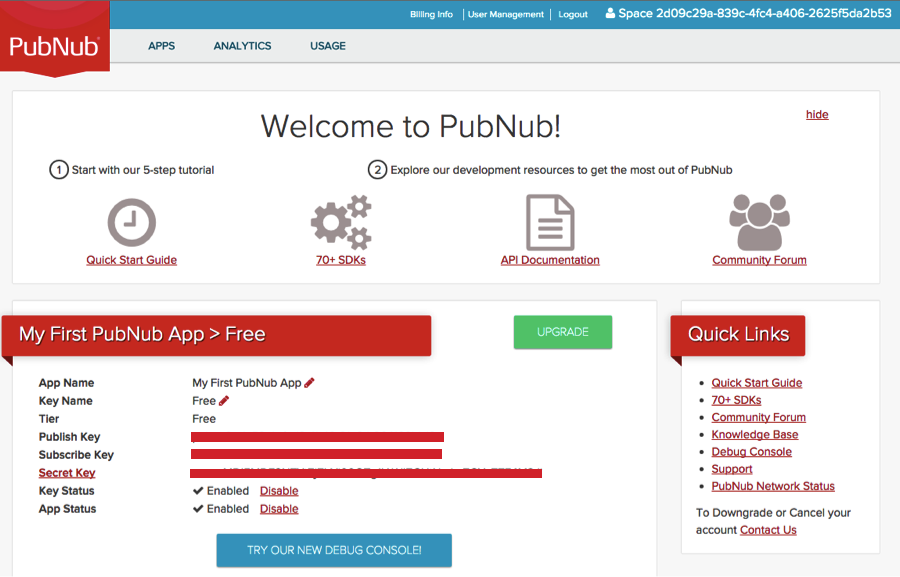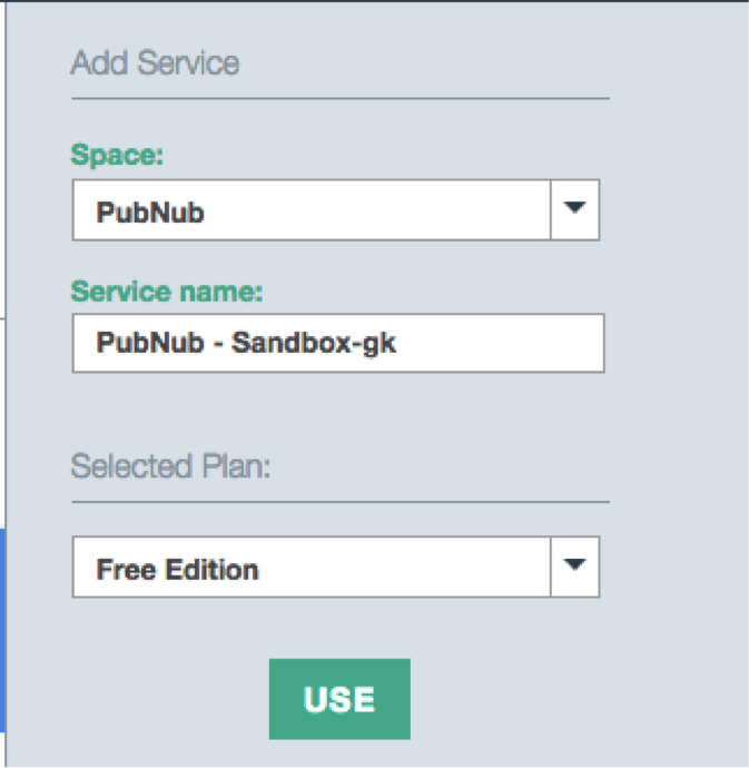 Click the Use button in the Add Service form (PubNub’s sandbox service instance is shown above), which will load up the dashboard launch window:
