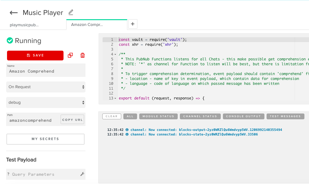 Now, that we have a reference to the user's speech input, the next step is to process this data. We will do this by passing it into our Amazon Comprehend BLOCK. To add the block into your project, click the plus button and you will be prompted to add a function to your module. We will name our function Amazon Comprehend and set the event type to onRequest. Then set the URL path to amazoncomprehend. The default Amazon Comprehend BLOCK code is for a Before Publish handler. However, we want our block to be a OnRequest handler, so copy and paste this code into your editor.