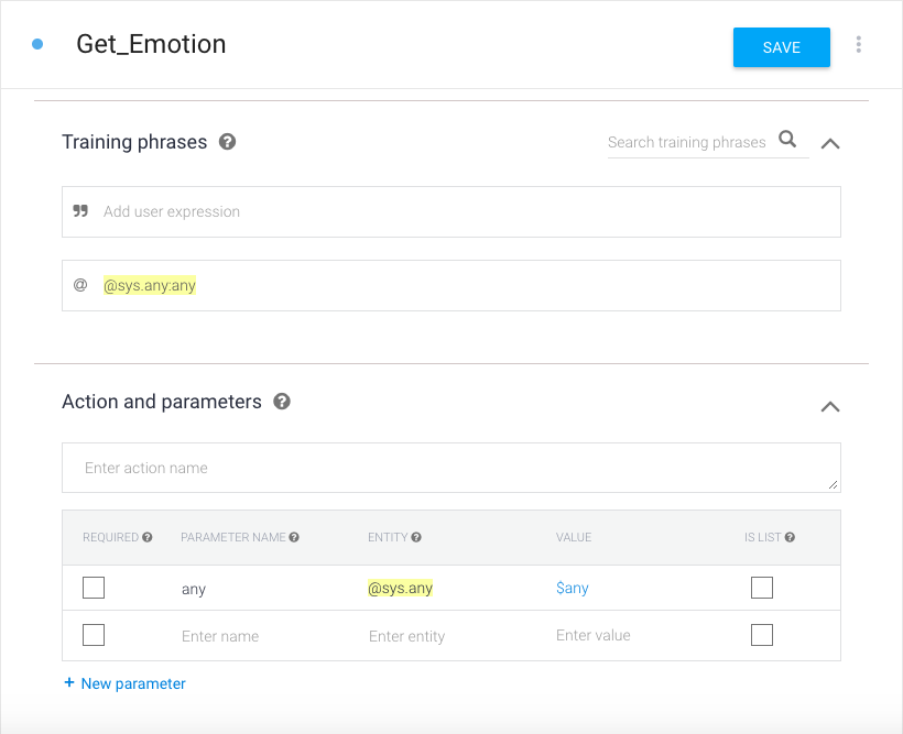 This new speech will trigger our new intent Get_Emotion. In order to create a new intent, click on the plus button on the side navigation bar of your console. We want our user to be able to say any sort of sentence with no specific pattern to trigger our Get_Emotion intent. Thus, we must specify this in our Training Phrases section of the intent. We will do this by clicking on the ” icon to change it to an @ icon and then typing @sys.any:any.