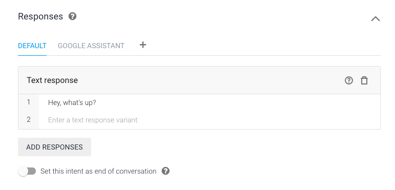 This new agent will have two intents by default: Default Fallback Intent and Default Welcome Intent. Think of an intent as a specific part of the whole conversation that is triggered when the user says a certain phrase. The Default Welcome Intent is triggered when the user invokes your app by saying “Talk to (Agent Name)” and the Default Fallback Intent is triggered when the user says something that the app does not understand or is not trained to respond to.
