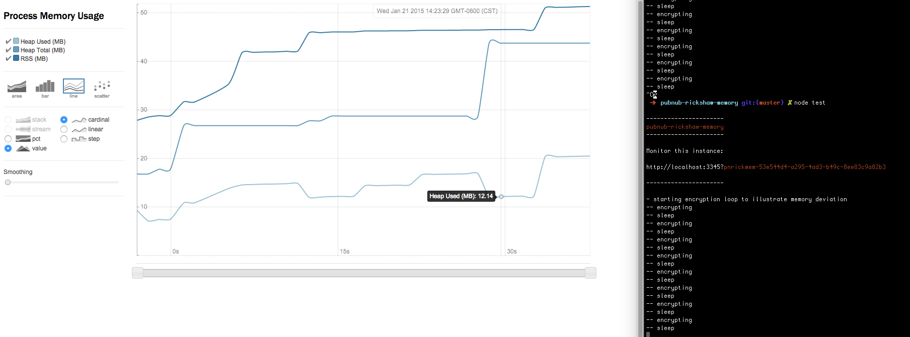 The npm module plugs right into our Rickshaw-PubNub library, and contains everything you need to get started right away. It'll automatically log your memory usage and spawns an express static server.