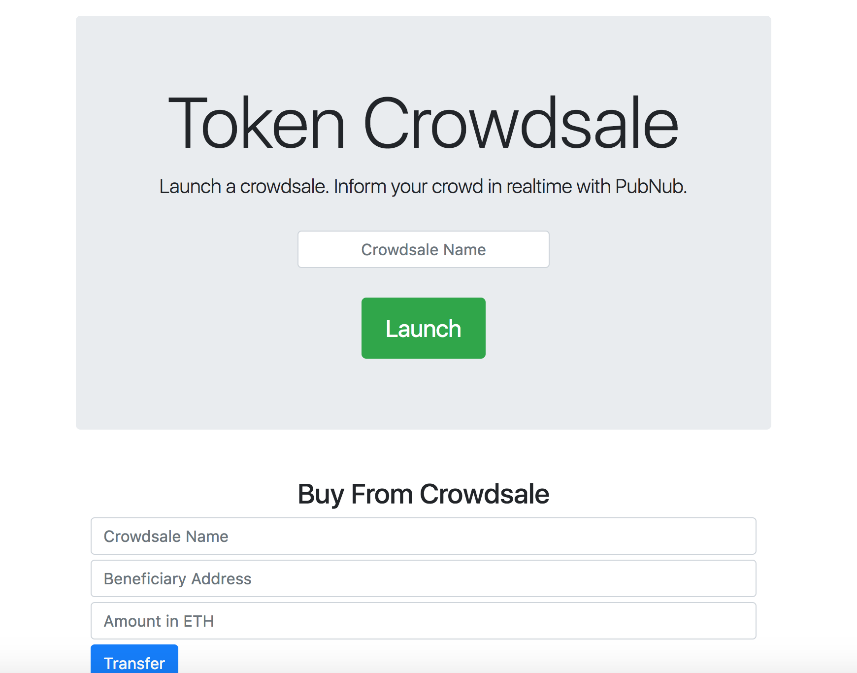 The app/ folder contains the web UI and also an extra bit of PubNub magic. When a crowdsale is launched, the owner has the option to text message all of their followers with the crowdsale details, so they can begin purchasing your token.