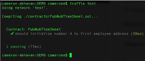 To run the test open up your terminal and go to the directory of your project and type “truffle test”. You should see an output like this: