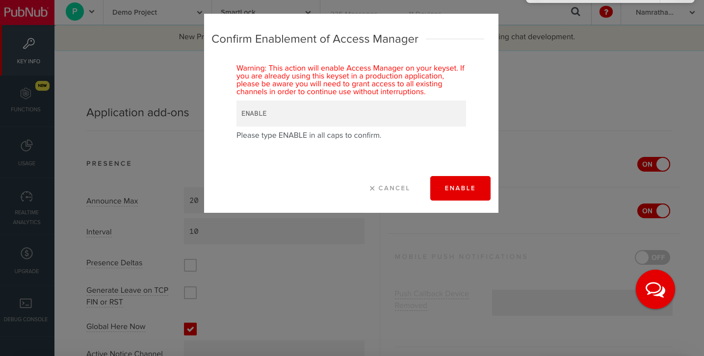 To access Access Manager you need to enable Access Manager in the PubNub Admin Dashboard (sign up first if you haven't).