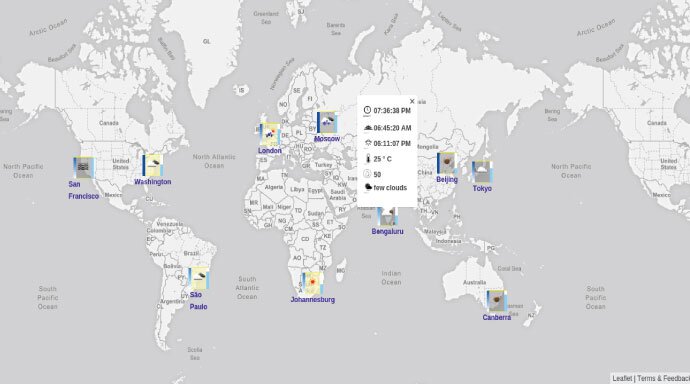 As can be seen, ten predefined cities from across the world have weather marker cards displayed against their name. These cards are updated once in 15 minutes to display the current weather conditions.