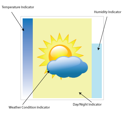 - Weather Condition Indicator : shows the current weather with several icons. It can include a mix of sun, moon, clouds, rains and wind icons to indicate an overall assessment of the current weather.