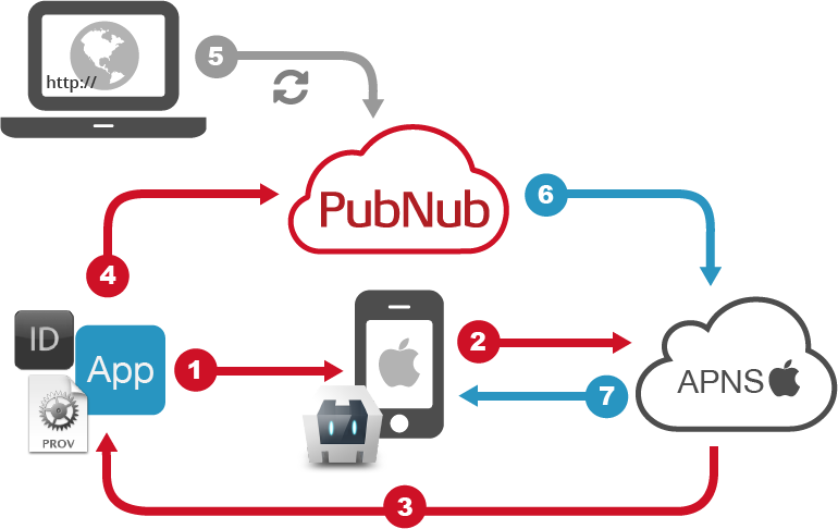 Apple Push NotificationService (APNs) is a service for iOS devices to send and receive push notification messages. The typical flow looks like: