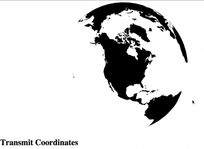 The visual medium for this type of tool could be D3.js’s orthographic projection. Check out the interactive orthographic example, provided by Mike Bostock. This example gives us the groundwork to transmit coordinates in real time. Create a file like d3_orthographic_send.html or use the copy provided.