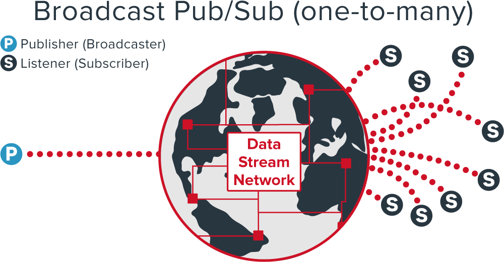 A broadcast pub/sub messaging design pattern is publishing data from one publisher (broadcaster) to multiple subscribers (listeners) in real time. Updates are sent from the broadcaster, and are received on the subscriber simultaneously. For example, we can build sports statistics streaming apps, or change colors on a webpage in real time.