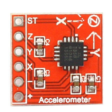 For this demo we're going to be using the SainSmart ADXL335 Triple Axis Accelerometer. The sensor is a polysilicon surface-micromachined structure built on top of a silicon wafer. Polysilicon springs suspend the structure over the surface of the wafer and provide a resistance against forces due to applied acceleration.