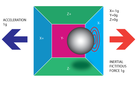 Accelerometers work like this. Imagine a cardboard box with a basketball inside. Now imagine picking up the box and moving it left or right. Depending on how fast you pick up the box, the basketball may hit the roof. If you move it left or right, it'll hit the sides.