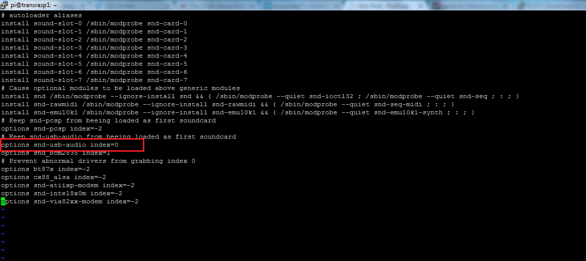 Open this file and change the value of snd-usb-audio index to 0.
