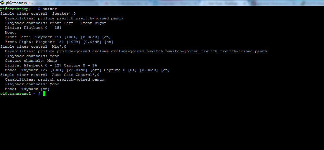 With the Raspberry Pi restarted, run the following command from the terminal prompt to see the current audio configuration: