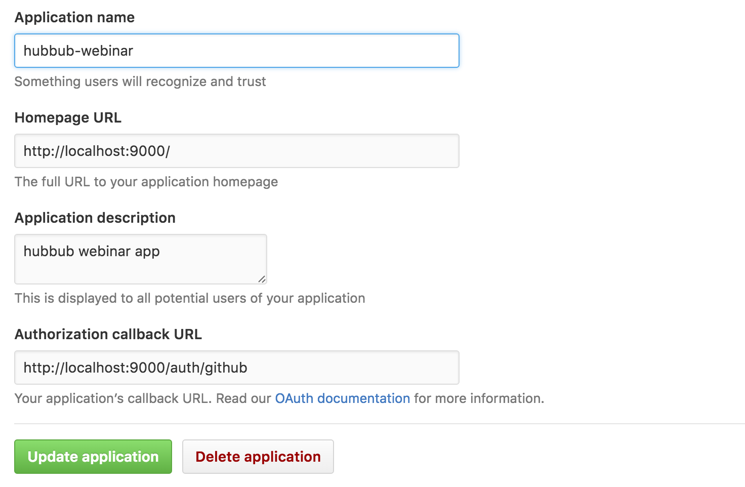 GitHub allows you to register your application to use GitHub as an Identity Provider. The application name is any name you like. The other two values are much more significant and must match the values you send to github during the authentication process. These two values are: