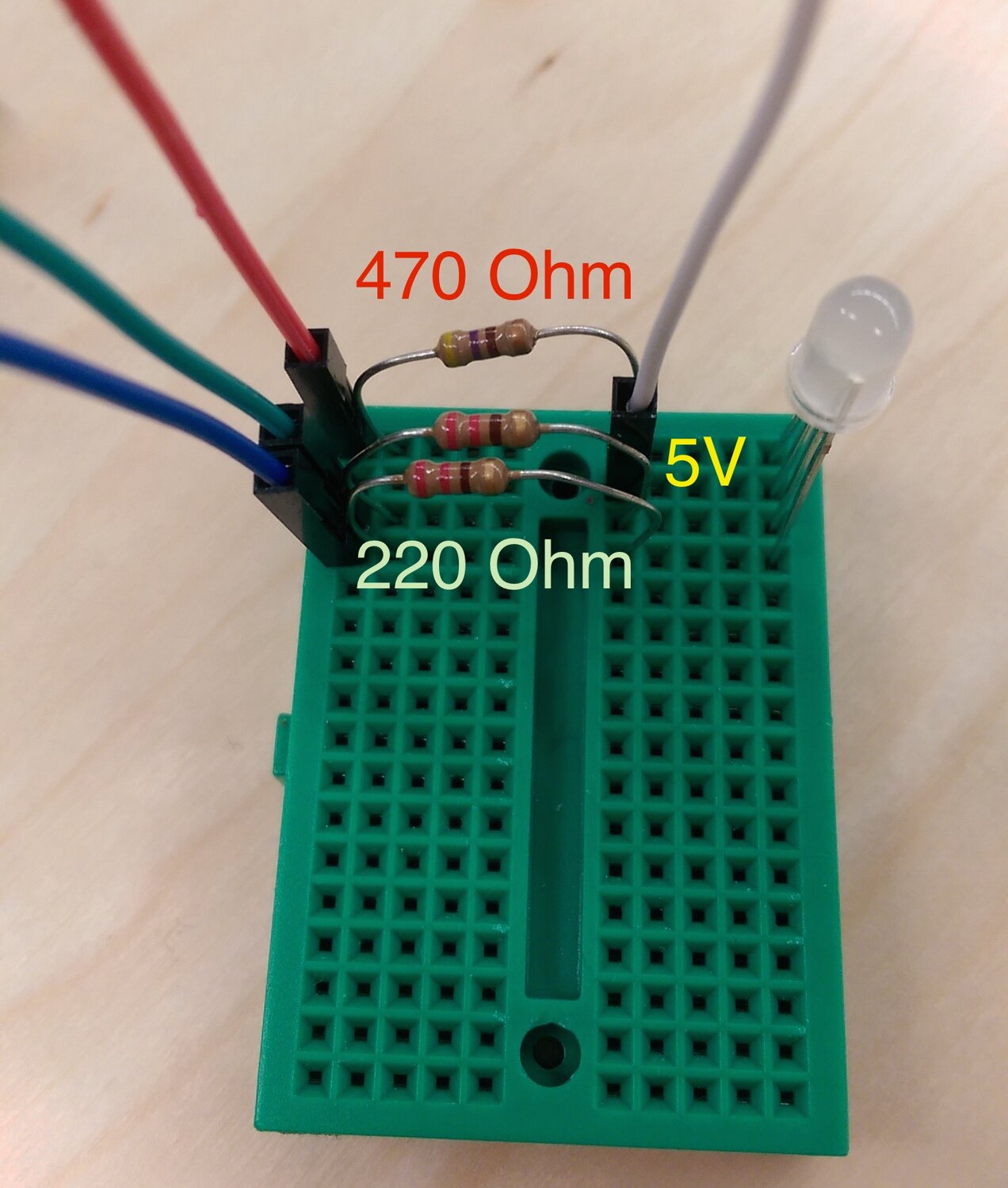 I said you will need ~300 Ohms, but notice that I use two different resistors. You can play around with what combination works best for you, but as a rule of thumb, the red light tends to overpower the green and blue, so I put a stronger resistor to reduce the current it receives. When we get our light on in the next step, I will show you how to set it to white. If you notice that the “white” looks a little red, you can change the resistor then.