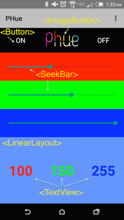 That’s all I have for you this time! Notice that I made the center button (between on and off) and ImageButton. You can make this button do anything you want with your PHue, see if you can get creative!