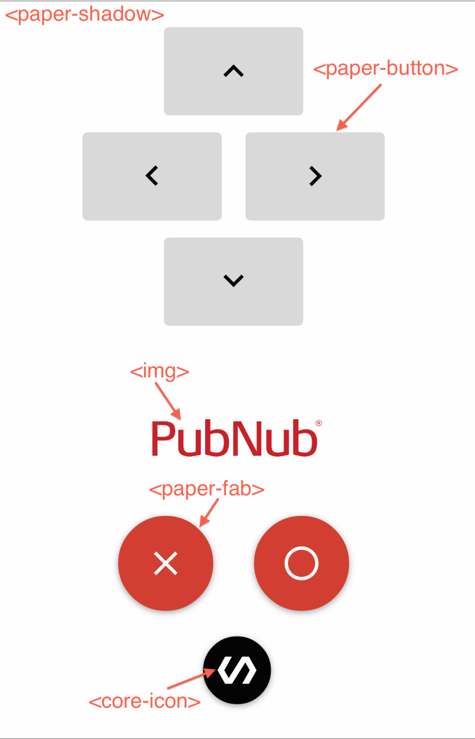 You can initialize the PubNub client using the <core-pubnub> element with your keys. Inside the <core-pubnub> we will use a <core-pubnub-publish> element to send keypresses from our gamepad.