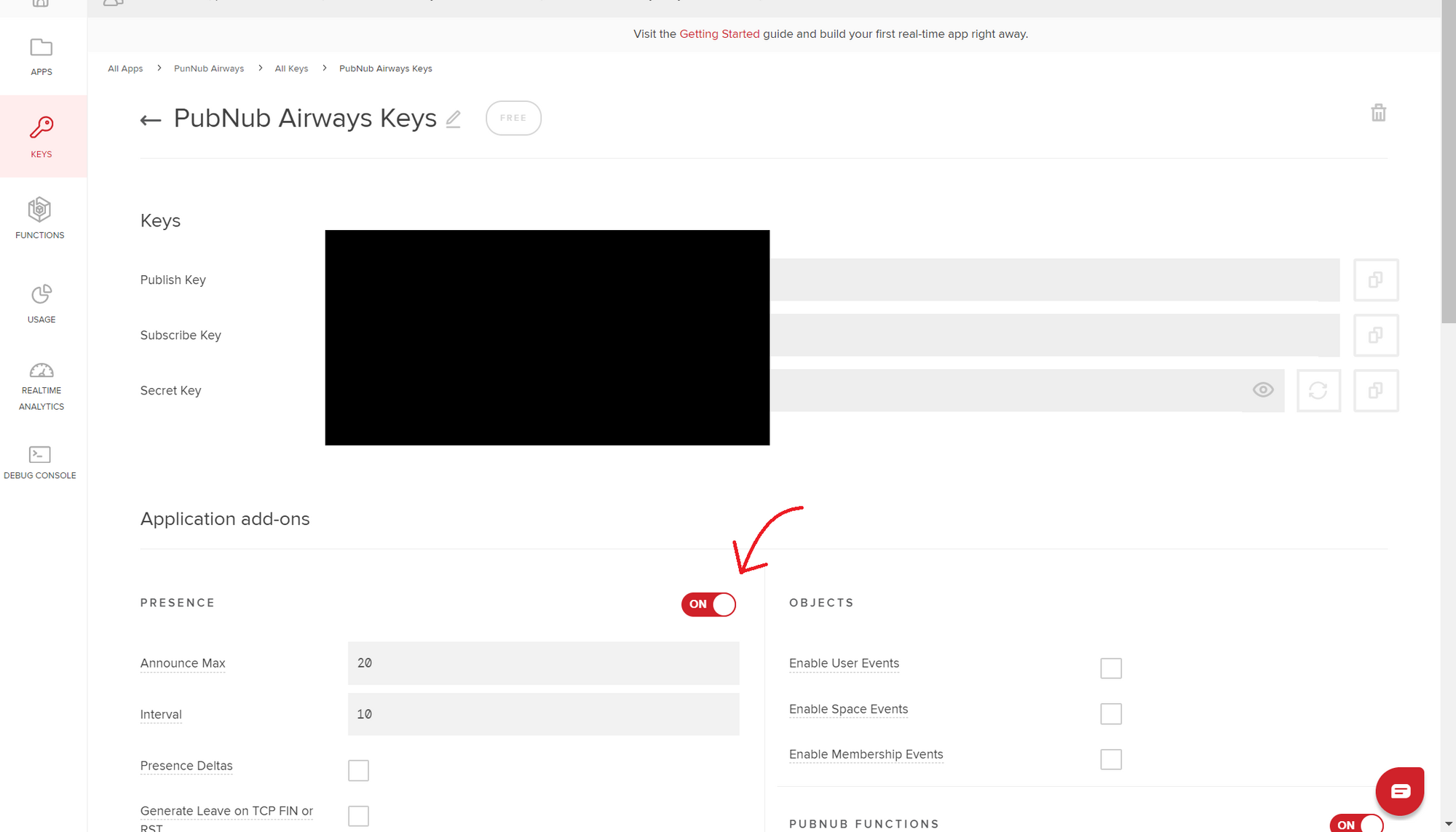 Enabling presence on PubNub.com