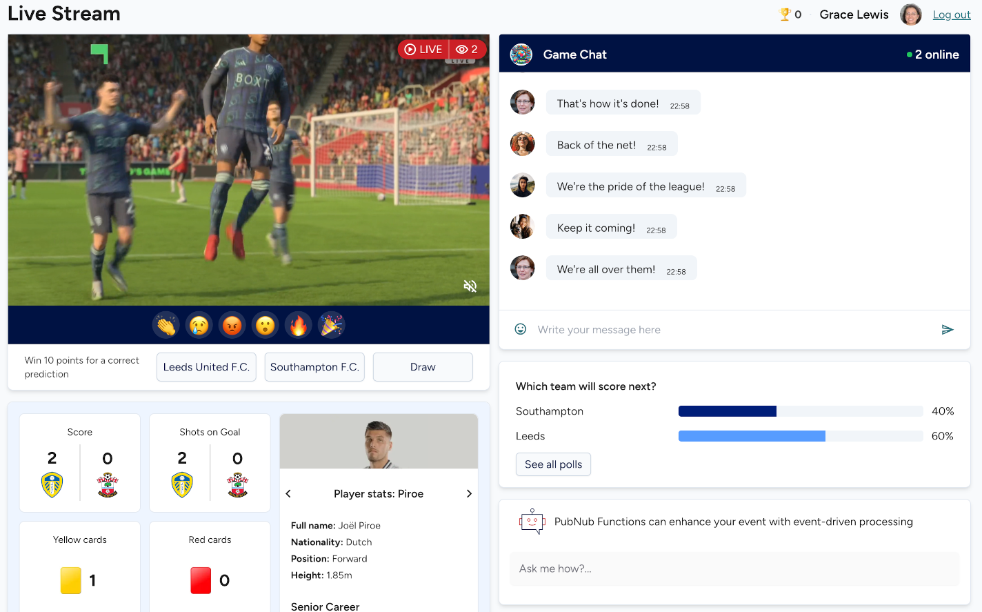 - Reactions to the live event, e.g. cheering, anger, celebration (PubNub Messaging)